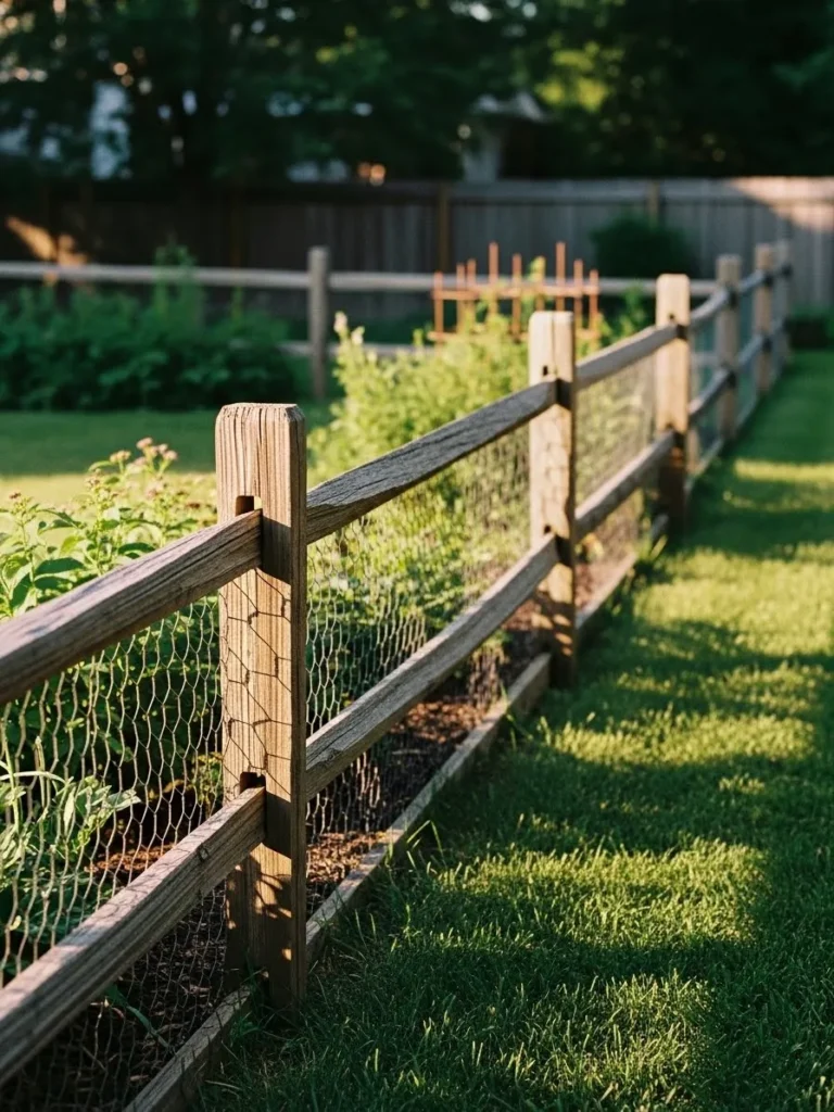 This split rail fence uses natural wood posts paired with simple wire mesh to create a look that feels relaxed and practical. The warm wood tones blend easily with the grass and garden beds, giving the yard a soft boundary without blocking the view. It feels open and friendly, perfect for a space that wants structure without looking fenced in.