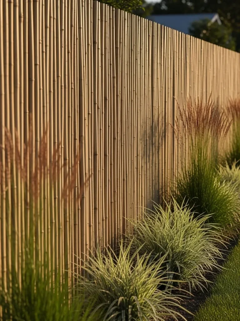 This fence design uses tightly packed vertical reeds to create a warm and earthy backdrop. The texture adds depth and softness, especially when paired with ornamental grasses and simple landscaping. It offers privacy while still feeling natural and relaxed rather than heavy.