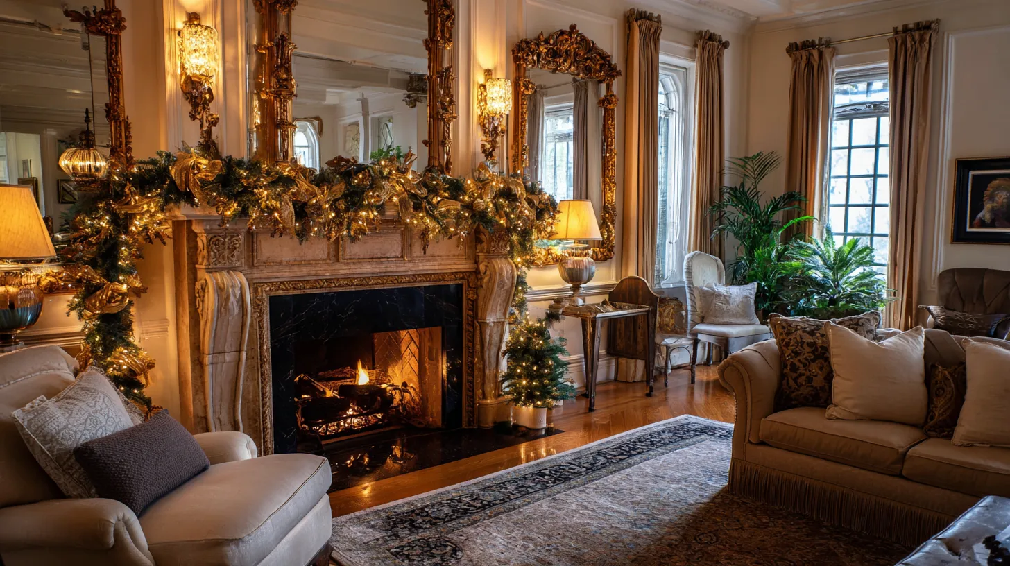 This opulent living room feels like stepping into a Christmas storybook. The ornate marble fireplace is framed by rich gold detailing and topped with an oversized antique mirror that reflects the soft glow of the fire. Lush garlands trimmed with twinkling lights and tied with deep red velvet bows drape gracefully across the mantel, adding a touch of classic holiday charm. Surrounded by plush seating, warm candlelight, and layers of luxurious texture, this space radiates old-world sophistication.