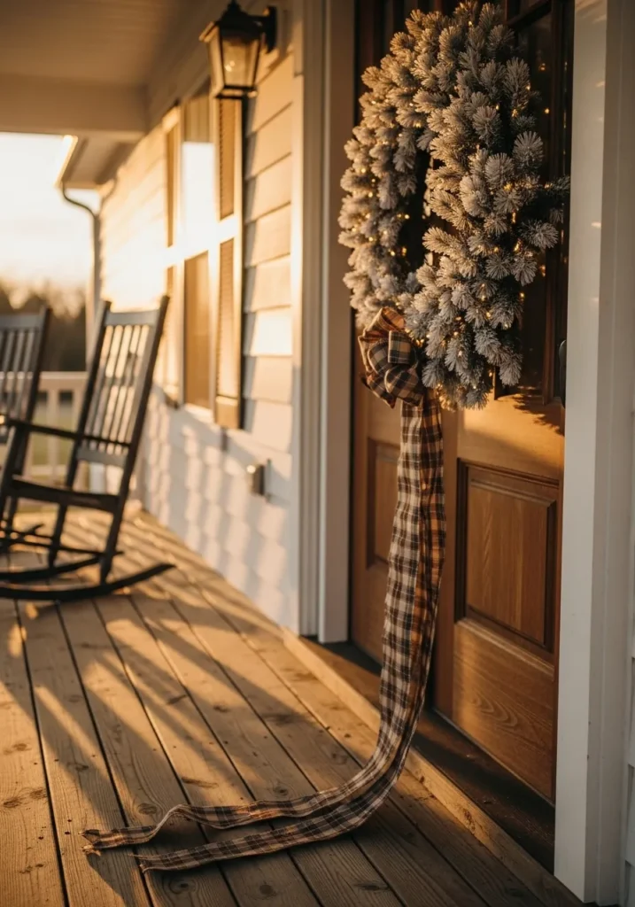 This wreath feels wonderfully classic with its full snowy branches, glowing fairy lights, and a long plaid ribbon trailing gracefully down the door. The golden hour light hits it perfectly, creating a warm, nostalgic glow that feels pure Christmas.