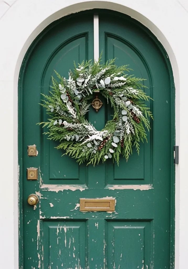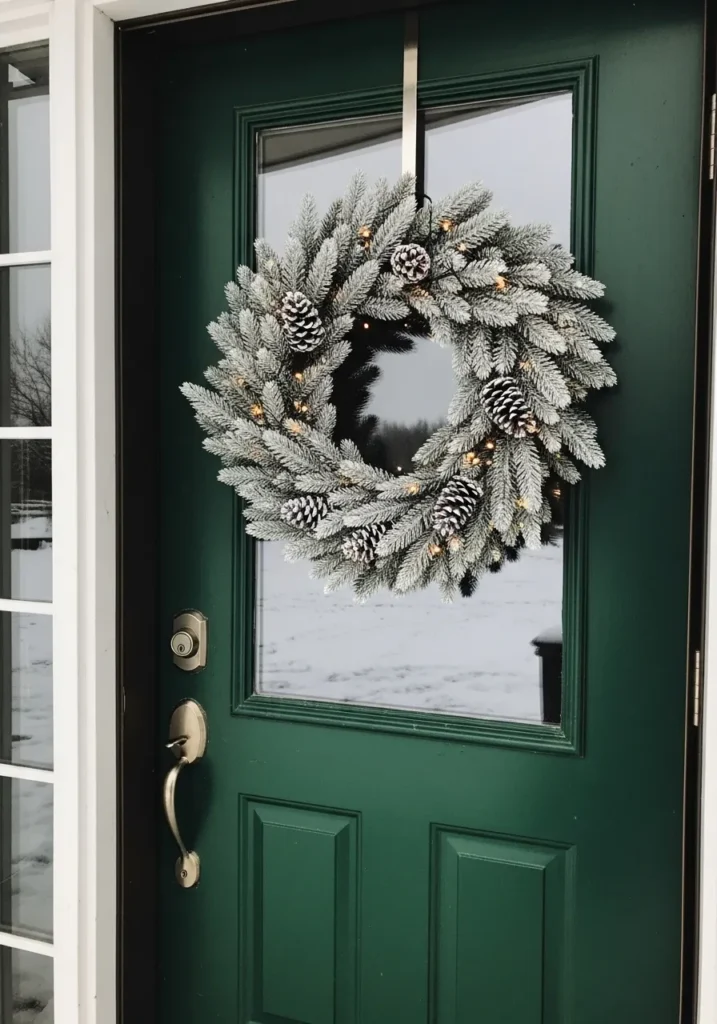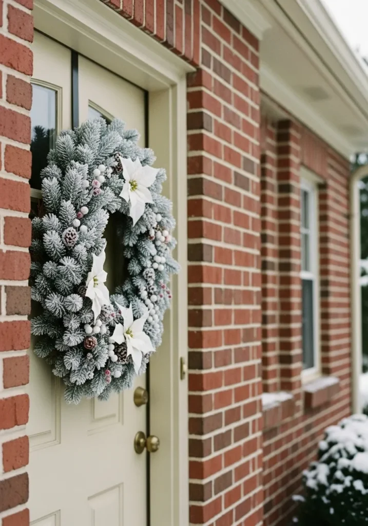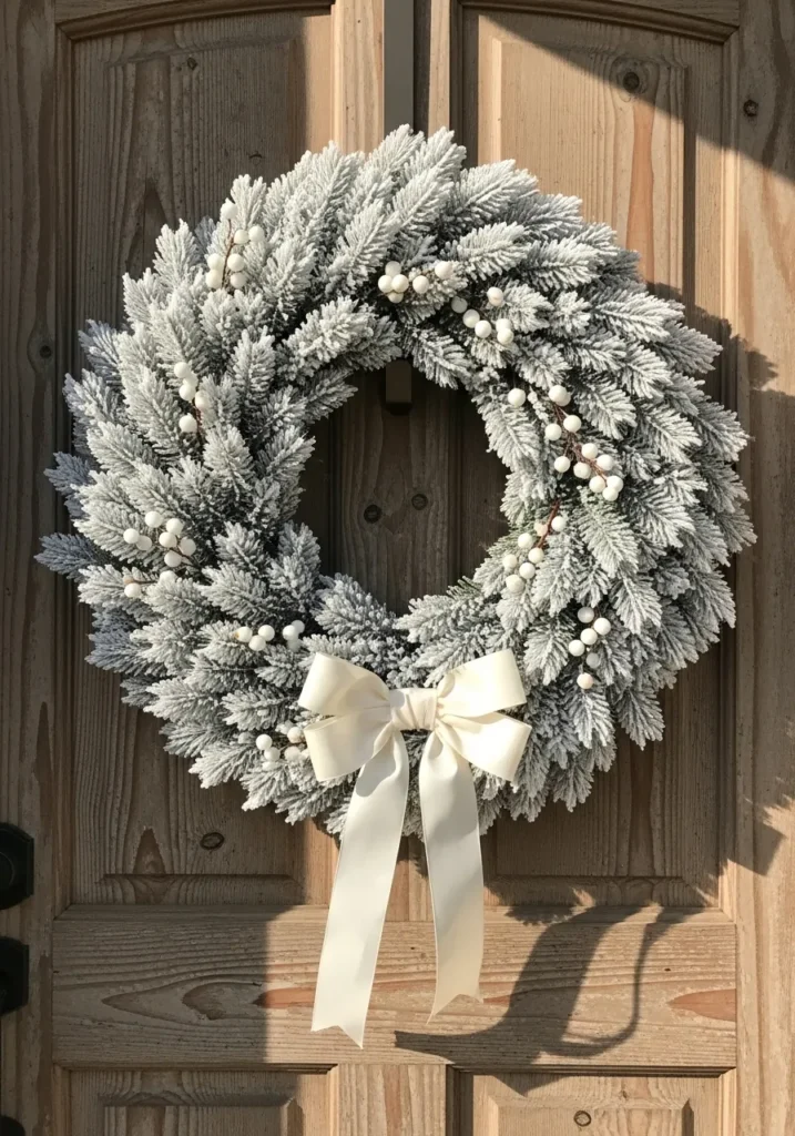 I’ve always had a soft spot for Christmas wreaths that look like they’ve been kissed by freshly fallen snow. There’s something about that frosted texture that makes any front door feel instantly elegant and magical.