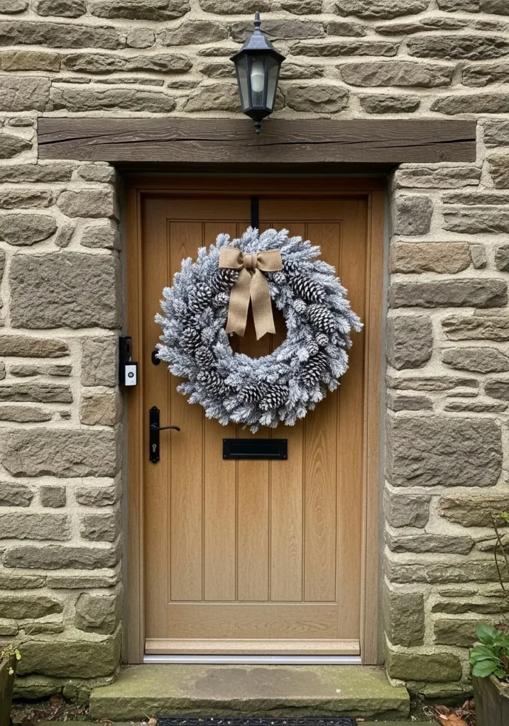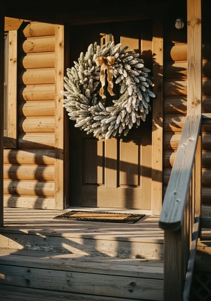 This wreath glows with warmth, its frosted pinecones and lights catching the soft golden sunlight perfectly. The natural brown tones of the door make the wreath’s snowy edges pop, creating a lovely mix of rustic texture and seasonal sparkle.