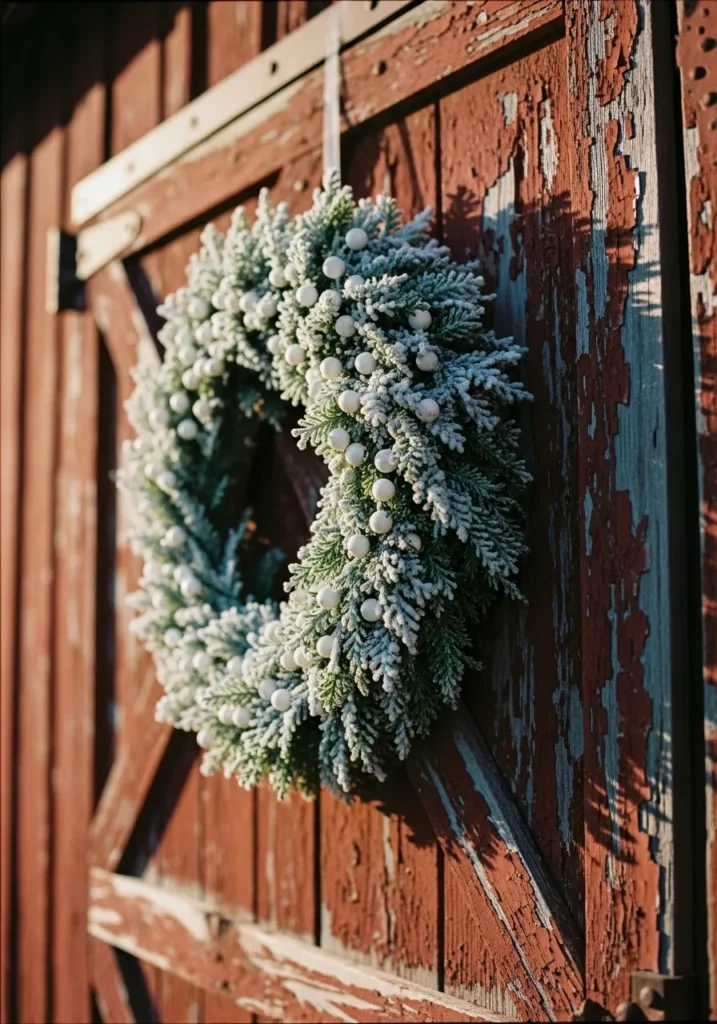 This flocked wreath feels straight out of a cozy countryside scene. It’s made of dense, frosted greenery with clusters of white berries that look like tiny snowballs resting on each branch. Hung on a rustic red barn door, the contrast makes it stand out beautifully and gives it that heartwarming farmhouse charm.