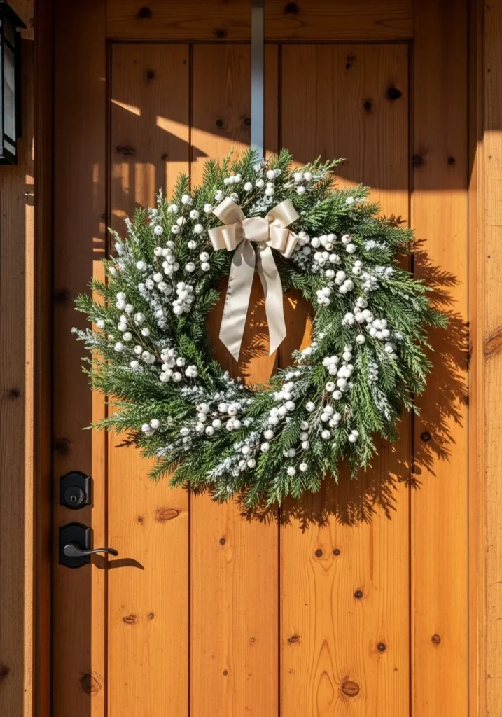 This wreath is full of texture and life, featuring frosted evergreens sprinkled with clusters of white berries and a silky ivory bow. The snowy greenery pops against the warm wooden door, creating that ideal blend of rustic warmth and winter freshness.