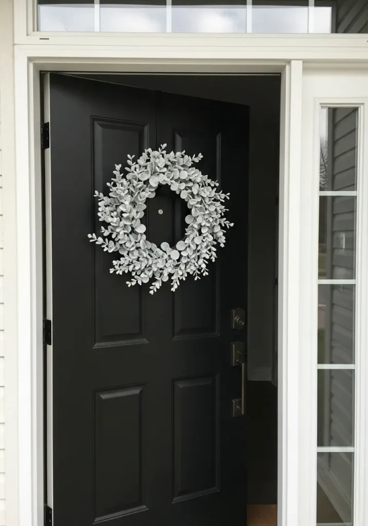 This wreath is made entirely of frosted eucalyptus leaves, giving it a light, airy feel that’s effortlessly chic. The muted silver tones catch the light softly, making it look almost like it’s covered in morning frost. Its minimal design stands out beautifully against the black door, proving that simplicity can still make a big statement.