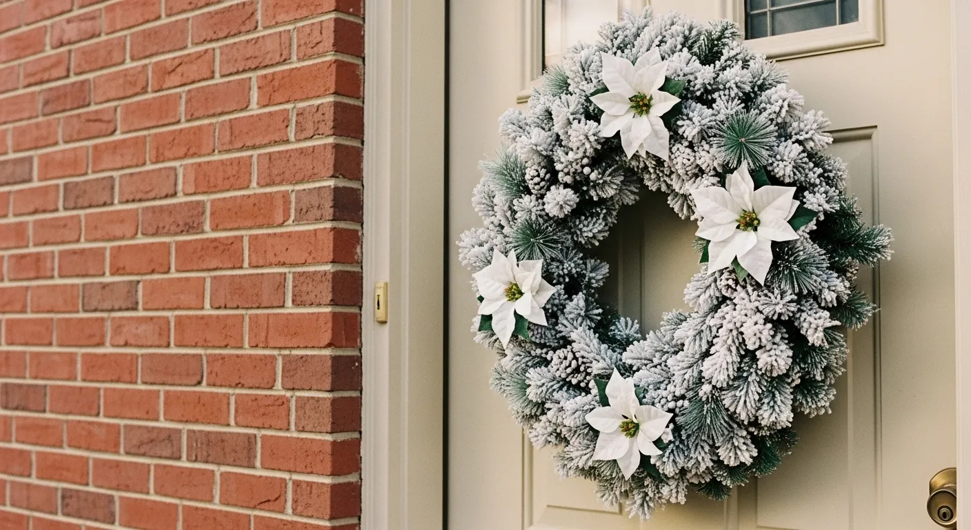 This wreath brings together flocked pine branches, white poinsettias, and tiny frosted berries in the prettiest way. The snowy look contrasts beautifully with the brick backdrop, creating a soft, feminine touch against the sturdy red tones.
