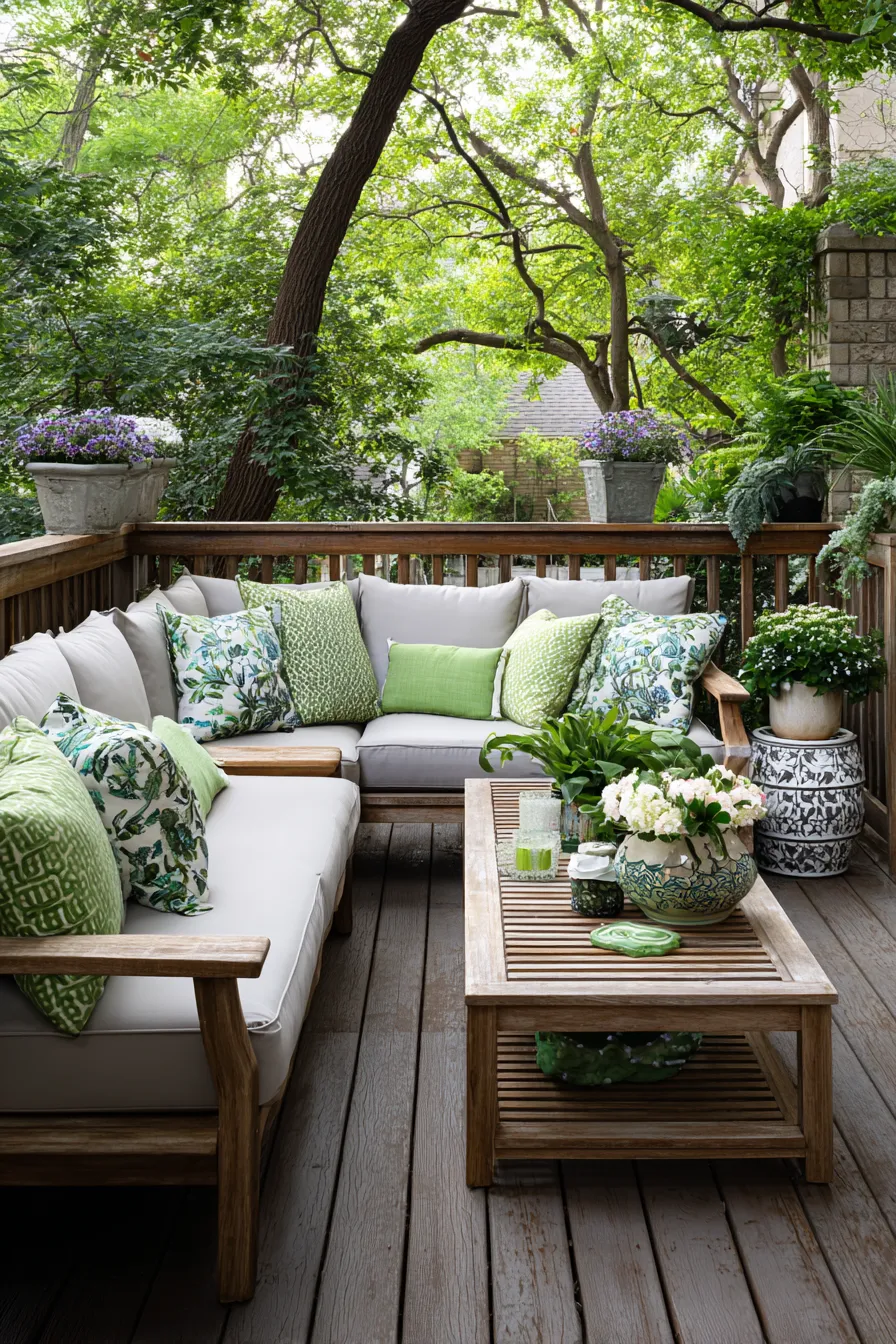 This deck blends natural wood furniture with green patterned pillows and lush potted plants for a calm garden inspired look. The surrounding trees add shade and a sense of privacy that makes the space feel tucked away.