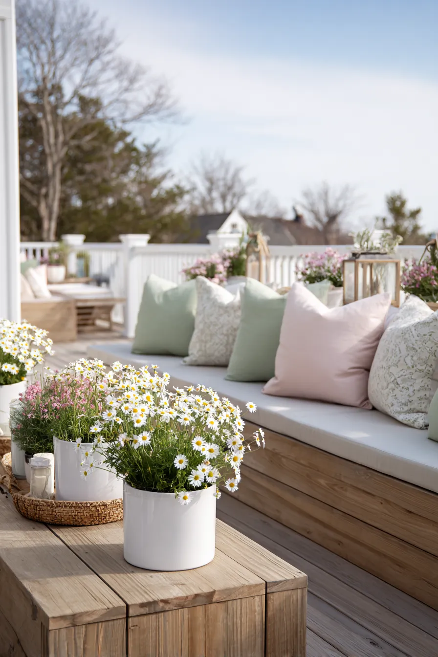 This deck feels soft and cheerful with its pastel pillows in mint and blush lined up along the built in bench. White pots filled with blooming daisies sit on a rustic wooden table and bring the sweetest spring touch.