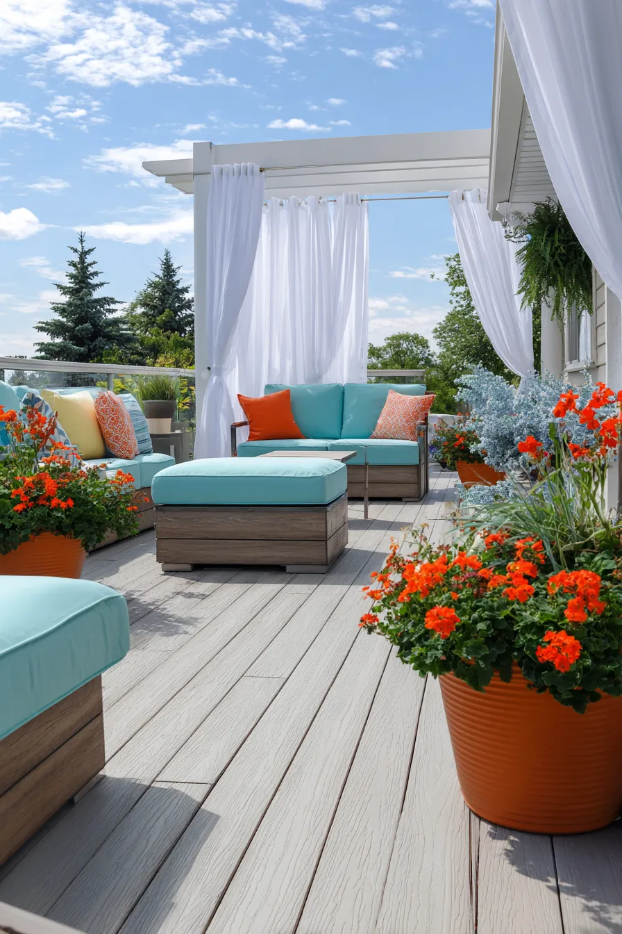 This setup is full of energy with bright aqua cushions paired with bold orange flowers and pillows. Flowing white curtains soften the look and create a breezy cabana vibe that feels perfect for warm days.