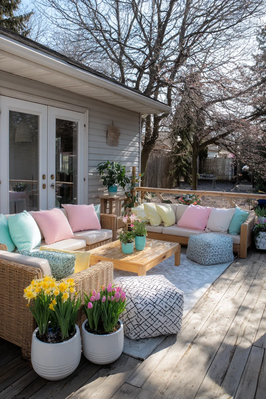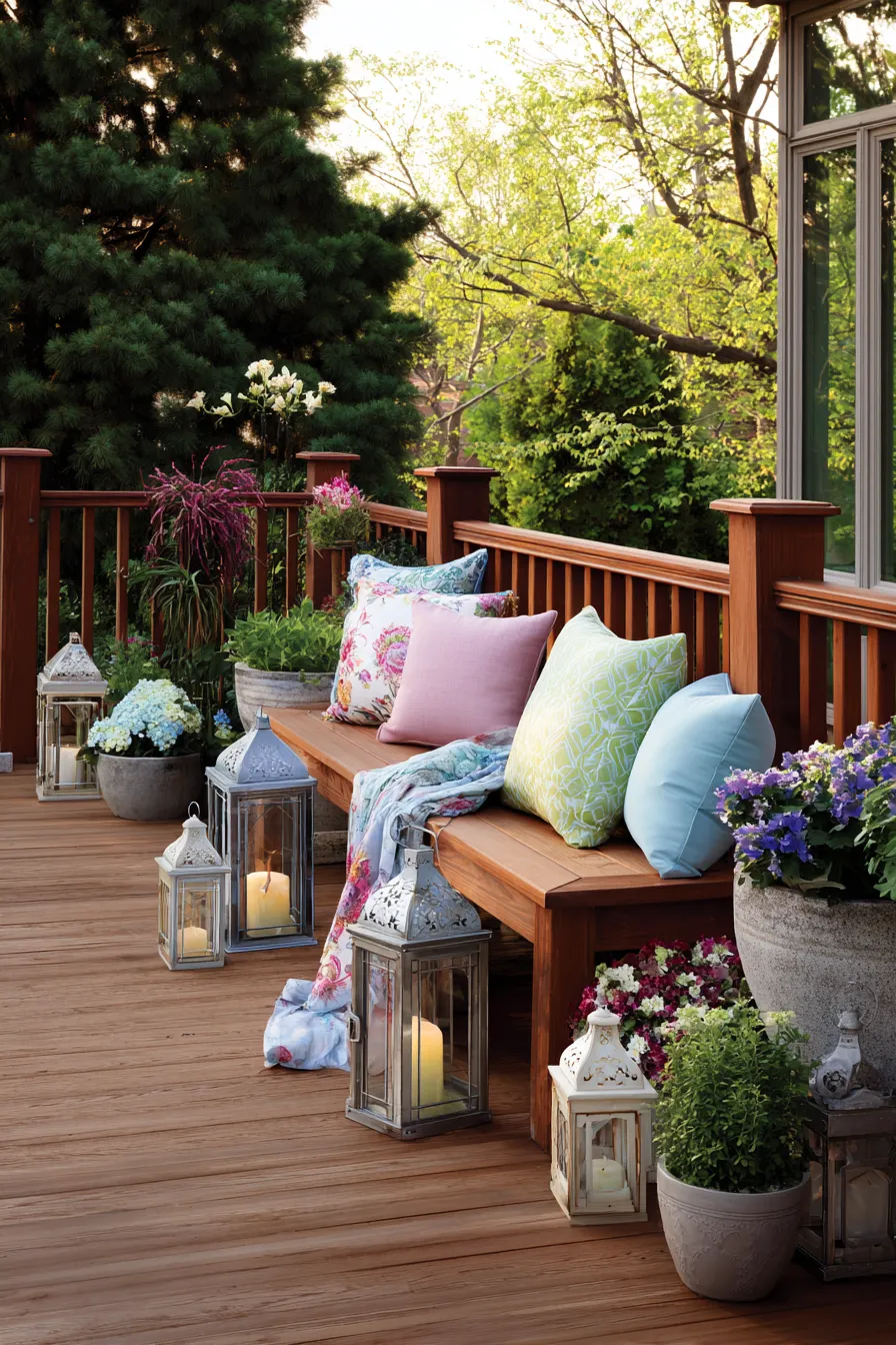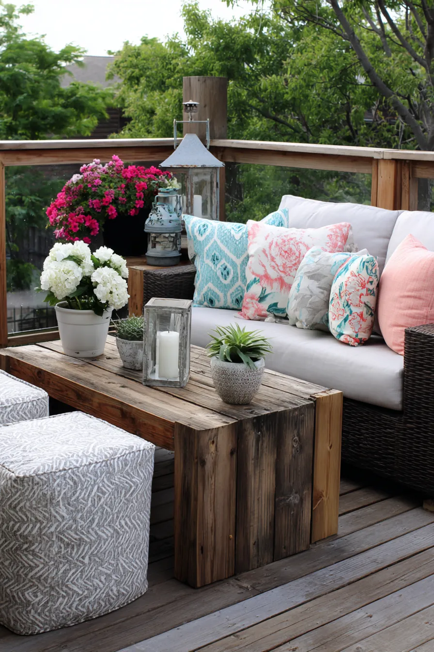 This deck mixes weathered wood with floral and pastel pillows to create a relaxed spring look. The rustic coffee table holds lanterns and potted blooms that add charm without feeling fussy.