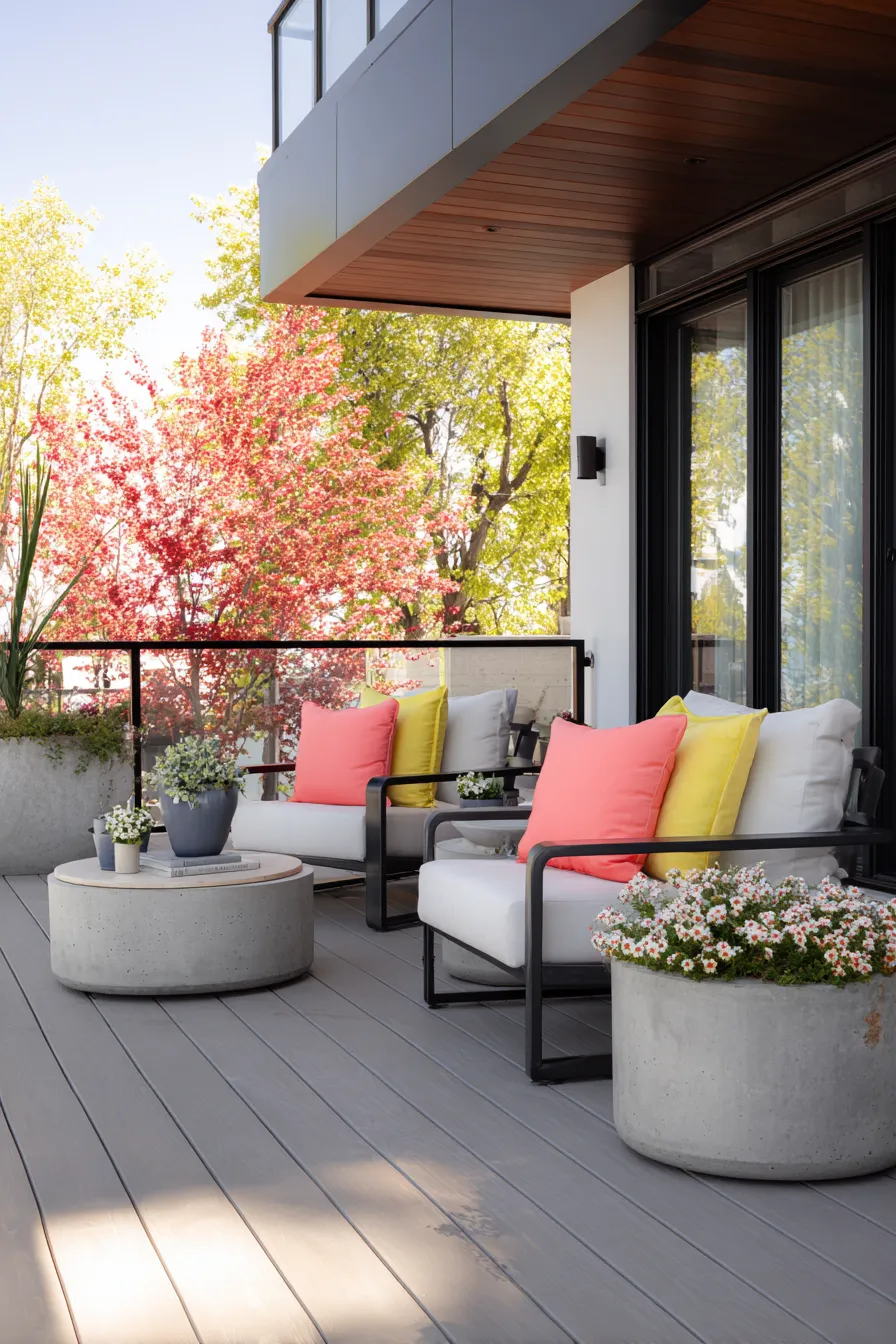 This modern deck uses clean lines and simple furniture alongside coral and yellow pillows for a fresh spring palette. Concrete planters filled with daisies and greenery add a soft natural touch.