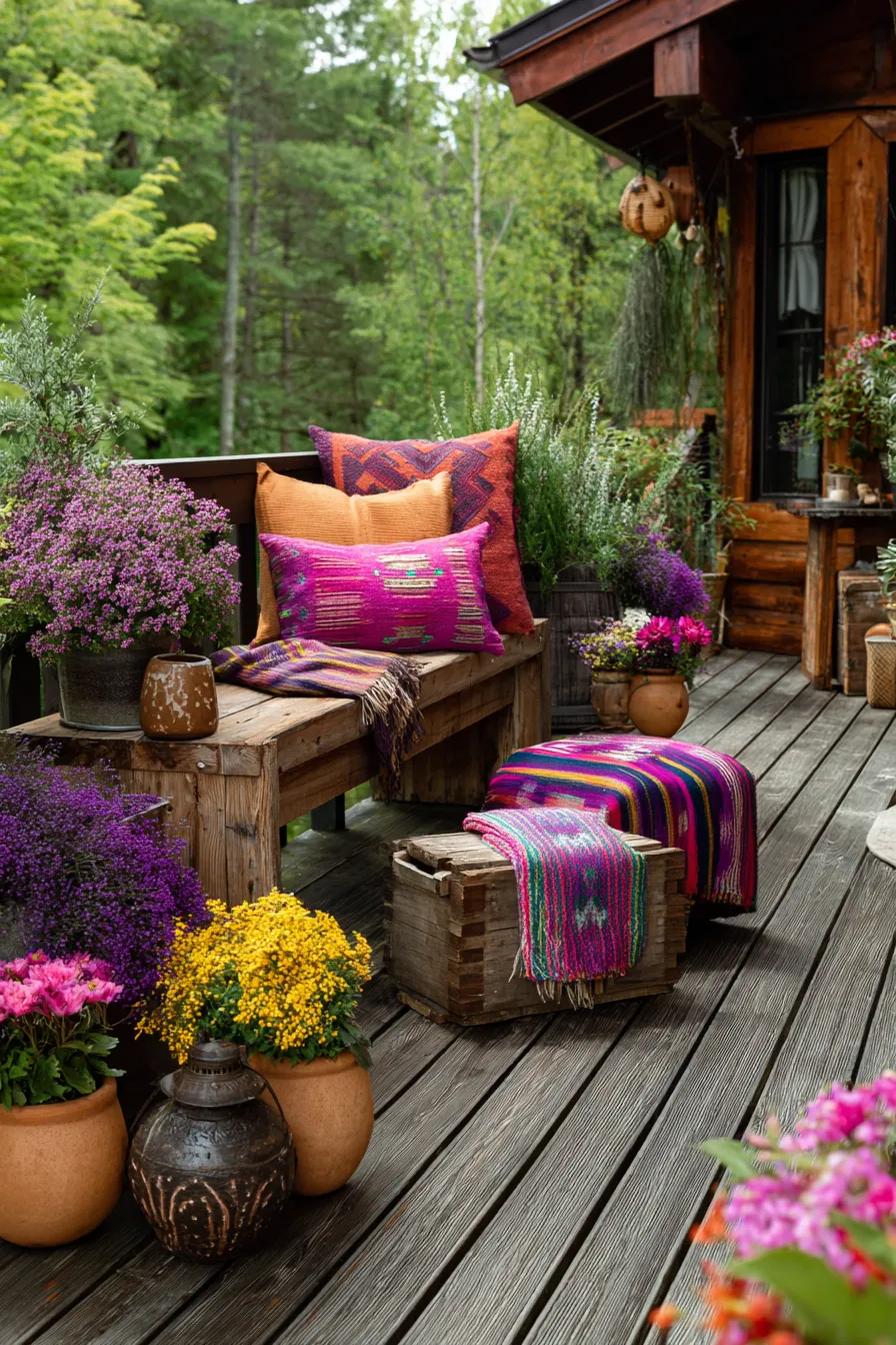 This vibrant deck is packed with colorful pillows blankets and pots of bright flowers that look like they were picked from a wild meadow. The warm wood tones make all the colors stand out beautifully.