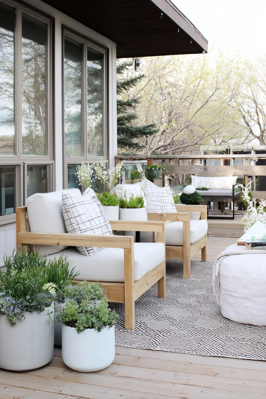 This space keeps things clean and understated with light wood furniture white cushions and geometric pillows. Soft green plants in white pots add just enough spring color without overwhelming the look.