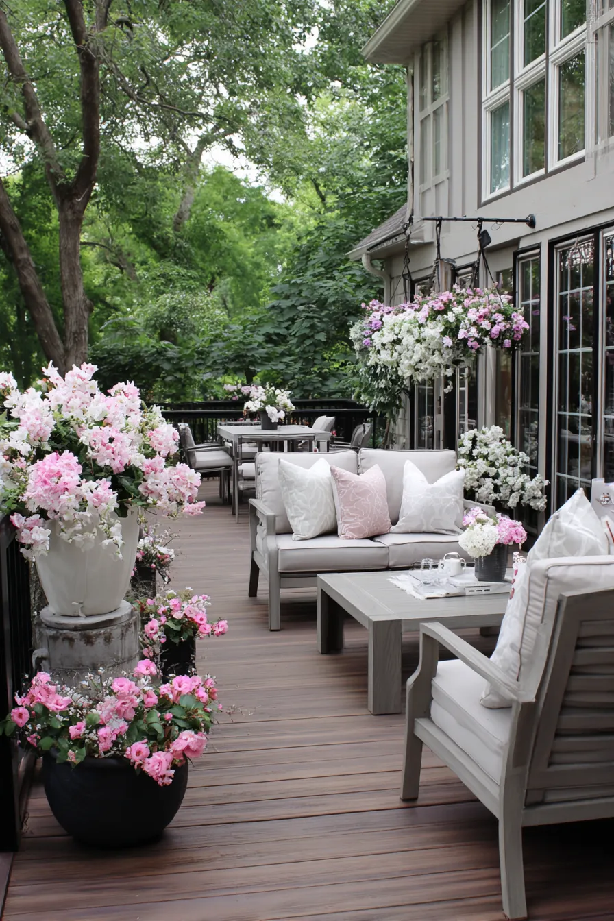 This long deck is filled with blush and white blooms in oversized planters and hanging baskets. Neutral furniture with soft pink pillows keeps the look elegant and romantic.