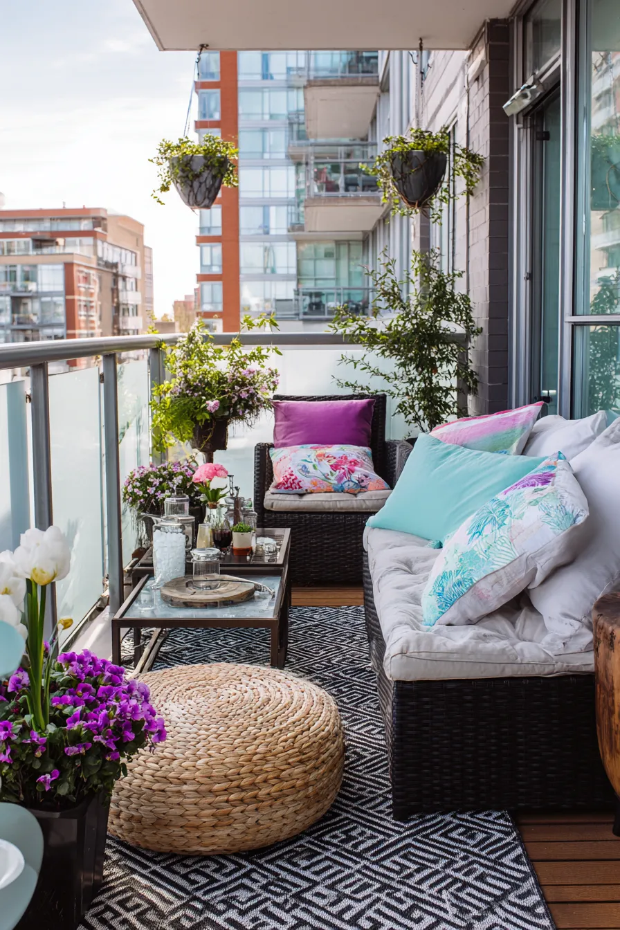 This balcony mixes woven furniture with pastel pillows and bright floral accents. Hanging planters and glass decor pieces add a charming layered look.