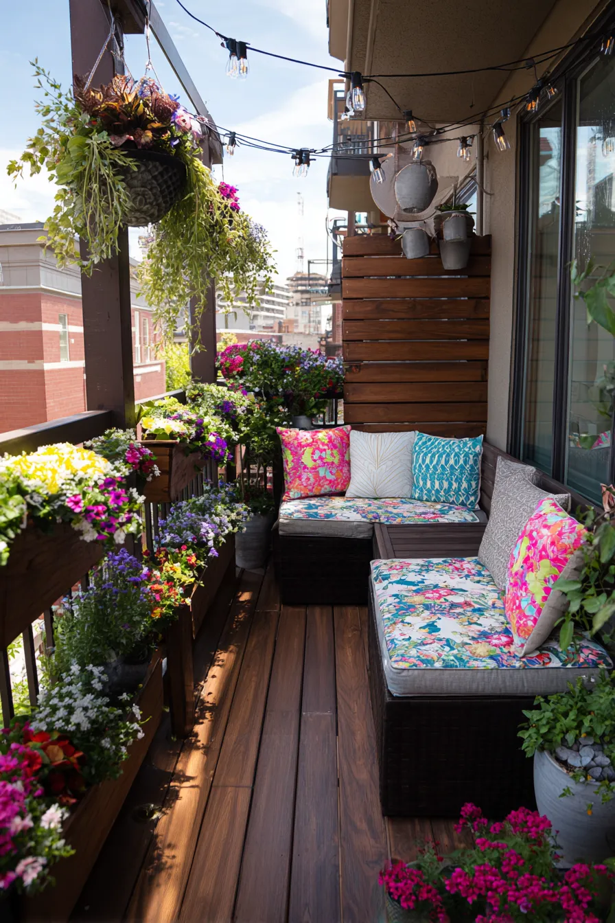 This balcony is narrow yet full of life with colorful flower boxes lining the railing and bright patterned cushions that match the vibrant blooms. String lights add extra charm in the evening.