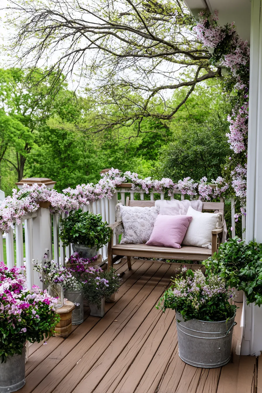 This deck feels like a spring dream with pale pink blooms wrapped around the railing, overflowing planters in every corner, and a cozy wooden bench layered with soft textured pillows. The soft greens in the background make all the color pop in the sweetest way.