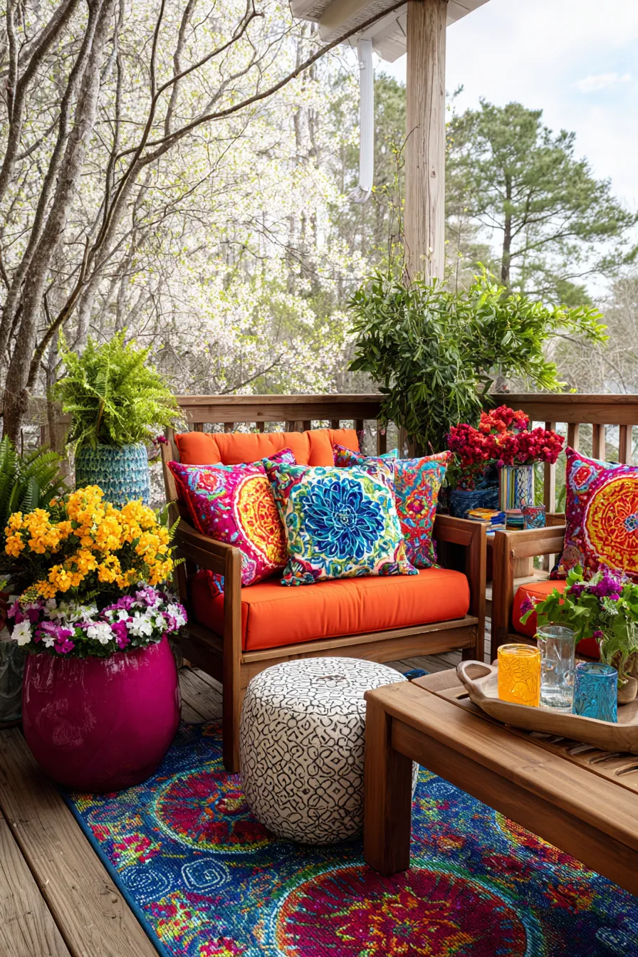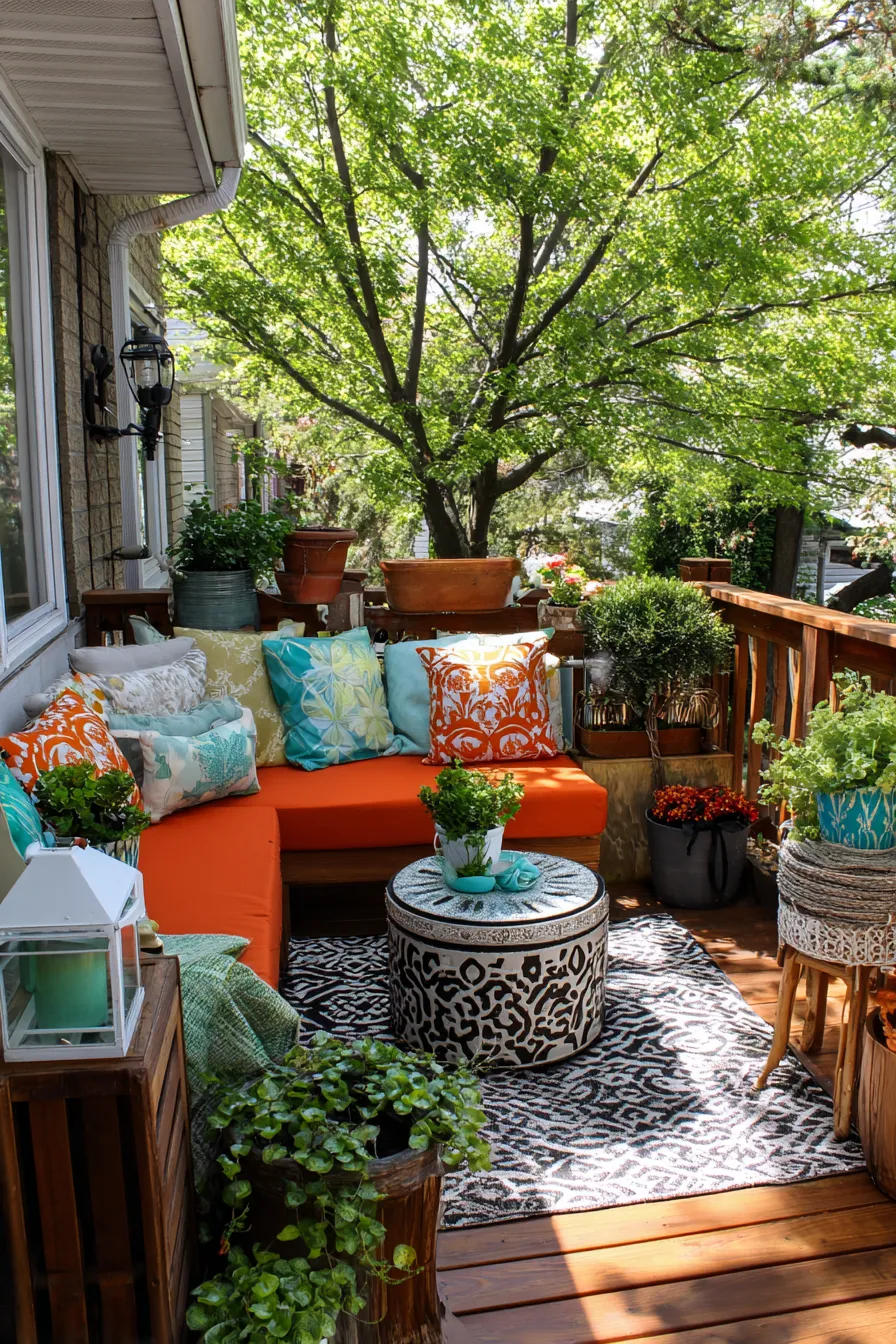 This deck is all about bold color and happy energy with bright orange cushions and pillows covered in vivid boho patterns. The mix of oversized planters, lush greens, and colorful blooms ties everything together and the patterned rug anchors the whole look in the best way. It feels lively and full of personality without ever looking chaotic.