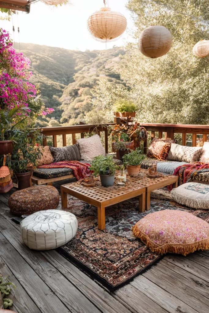 This space is full of bold patterns, layered rugs, and relaxed floor cushions that make the whole deck feel like an outdoor living room. The warm wood tones mix with vibrant textiles and hanging lanterns that glow in the late afternoon sun.