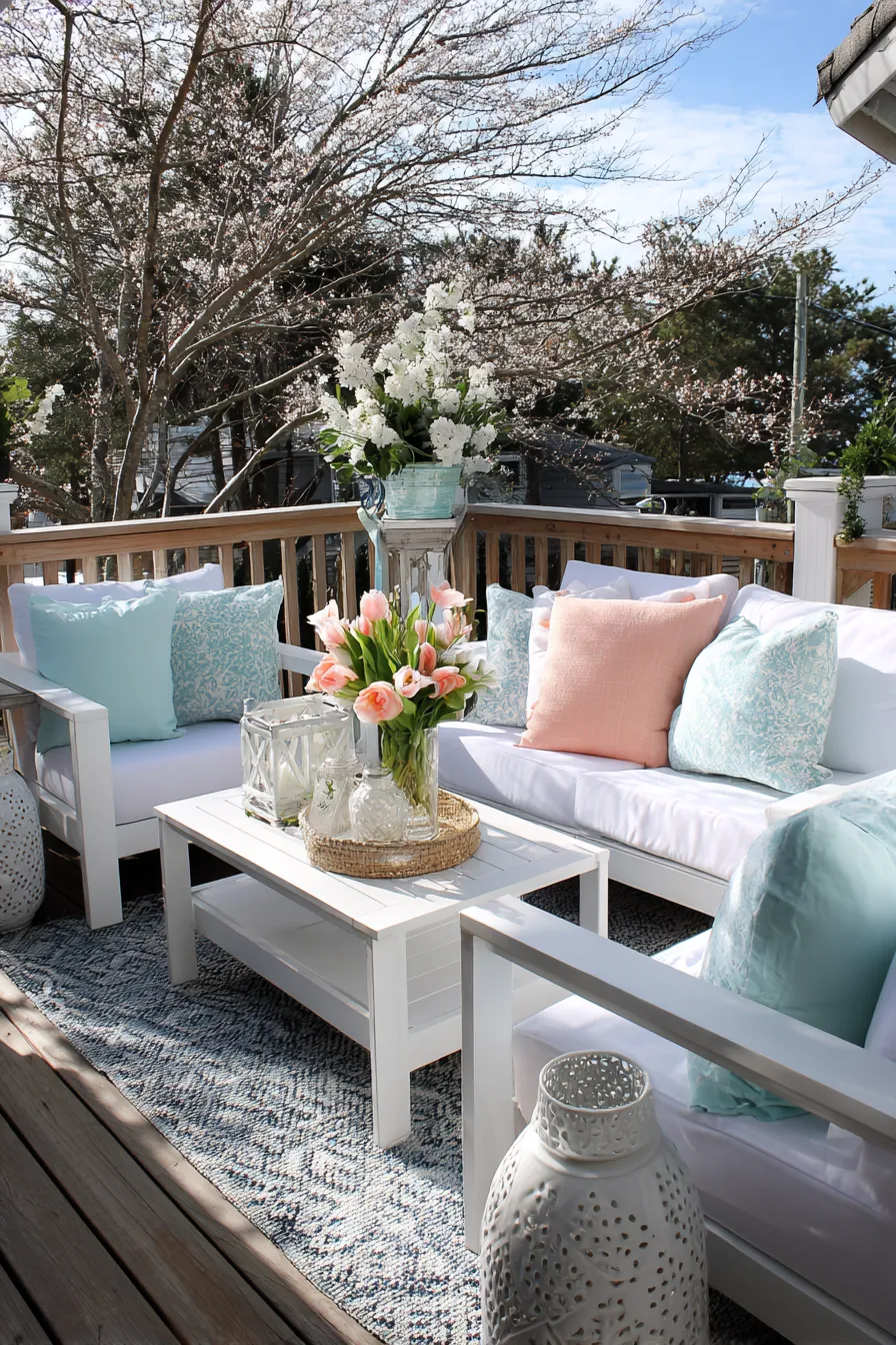 This deck brings together crisp white furniture with soft pastel pillows in peach and mint along with fresh spring florals that instantly brighten the space. The whole scene feels airy and fresh with sunlight filtering through blooming branches overhead.