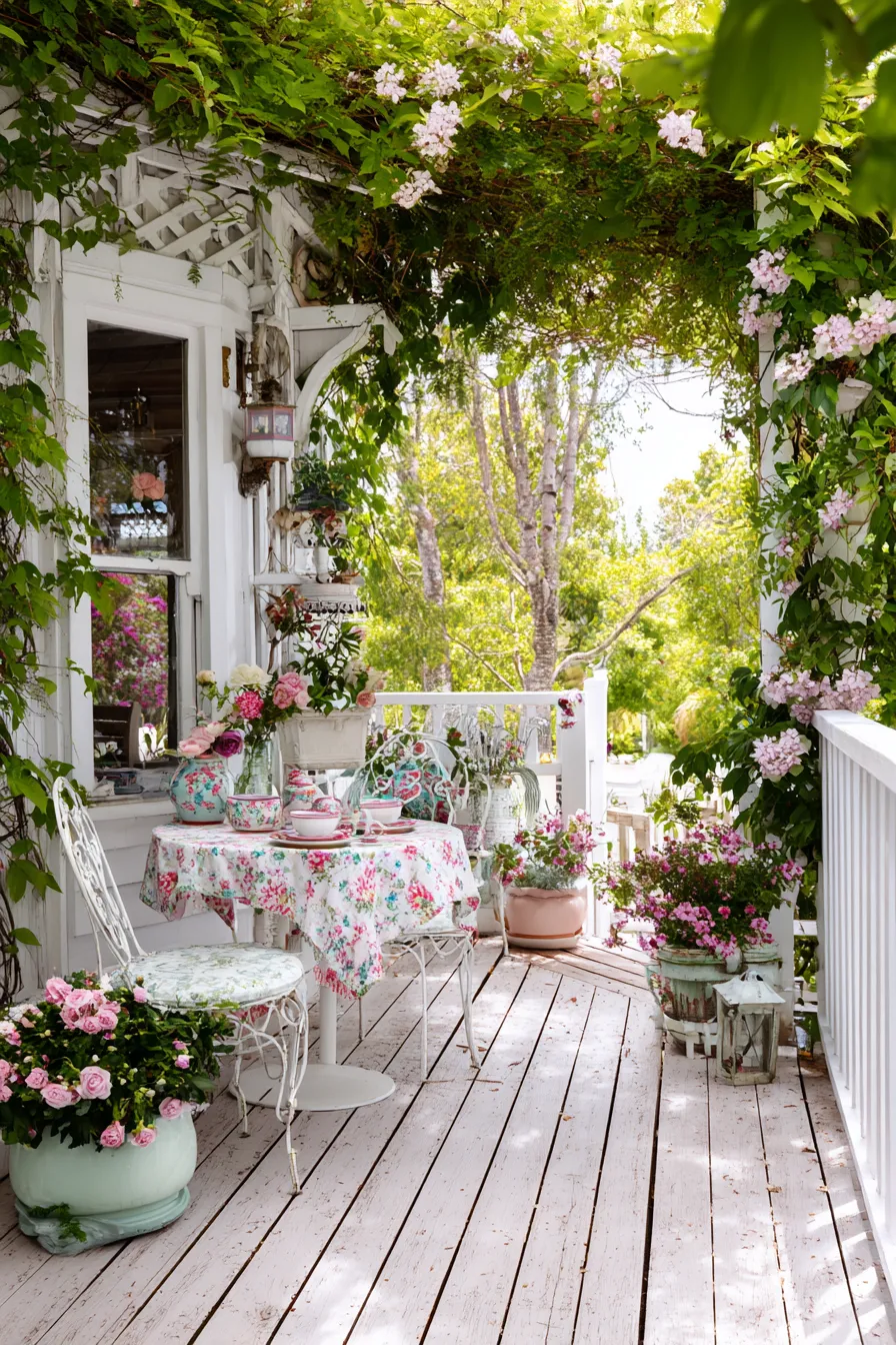 This floral filled deck feels like a sweet vintage tea garden with its lace textured metal chairs, patterned tablecloth, and pots of blooming pink flowers everywhere. The climbing greenery above adds a romantic canopy.