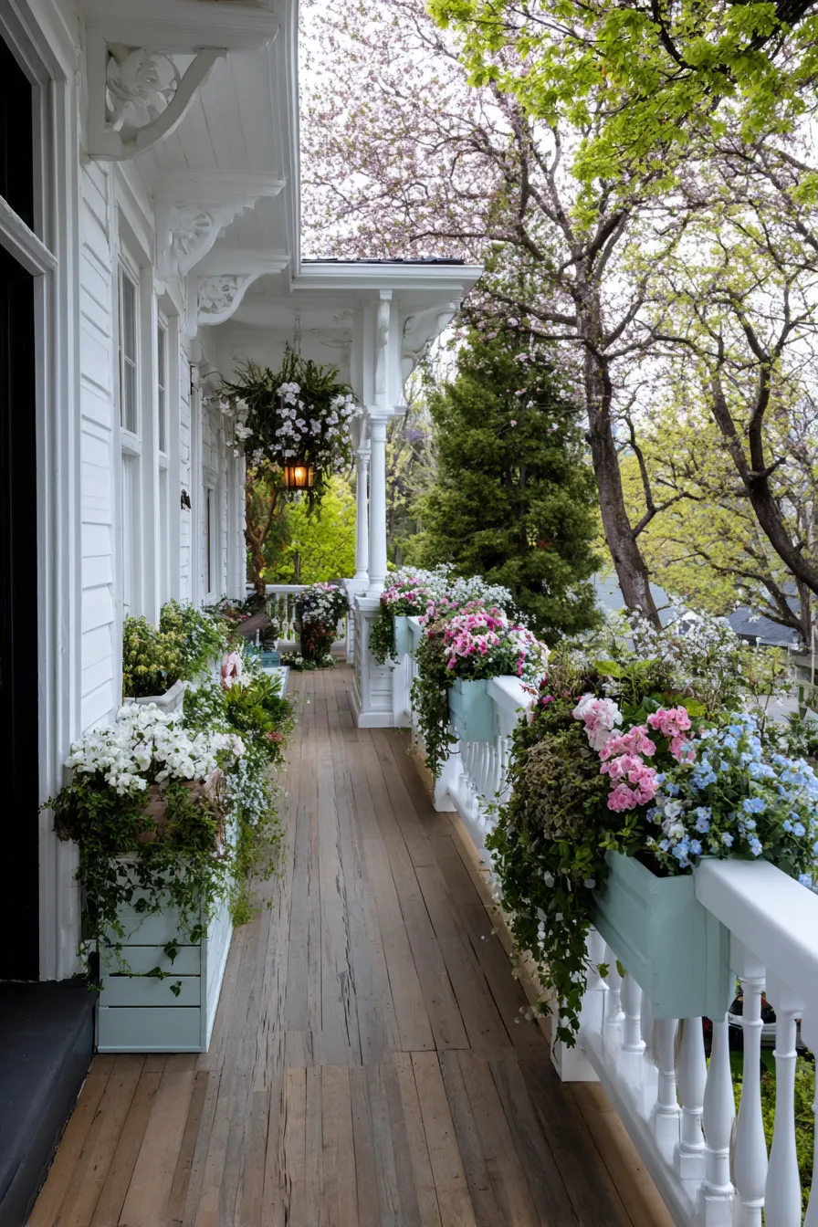 This long porch is lined with pastel window boxes overflowing with white pink and blue blooms. The crisp white trim and wood floorboards give everything a clean and charming backdrop.