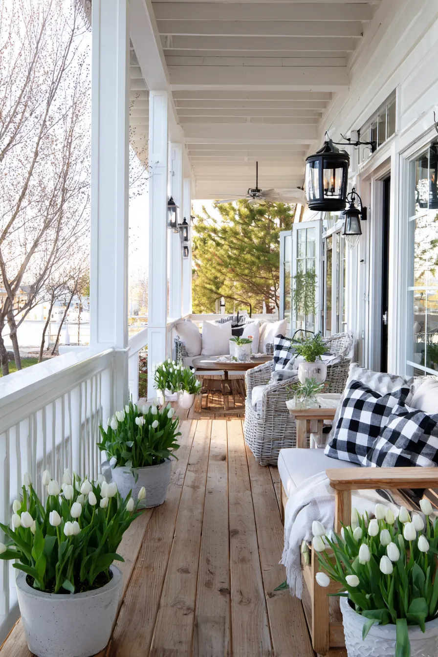 This long porch has neutral furniture styled with gingham pillows and big pots of white tulips that line the walkway. The clean white railing gives everything a fresh polished look.