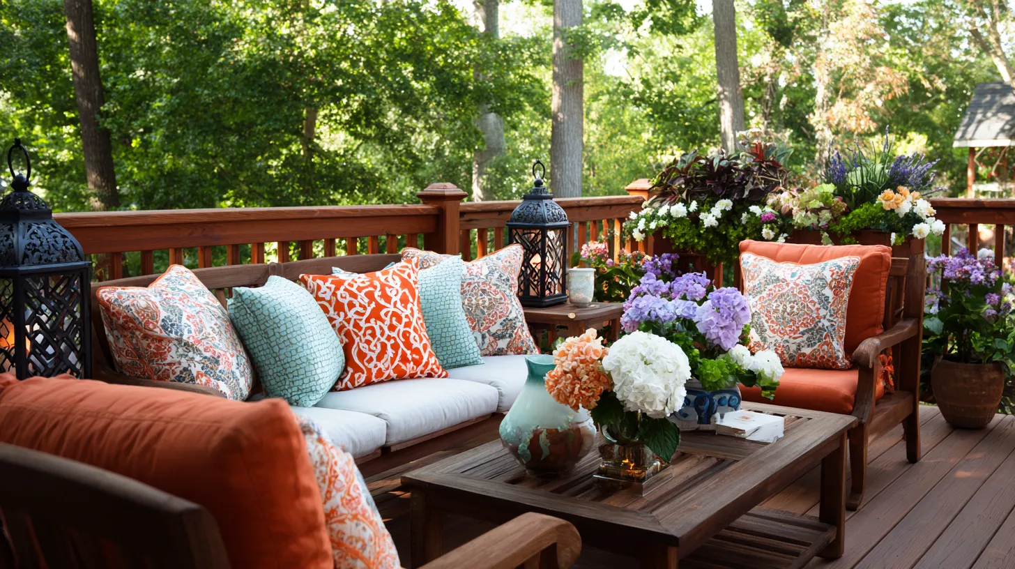 This deck uses bold orange cushions paired with turquoise and patterned pillows to create a lively spring palette. Potted greenery and flowers surround the seating area which makes the colors feel even brighter.