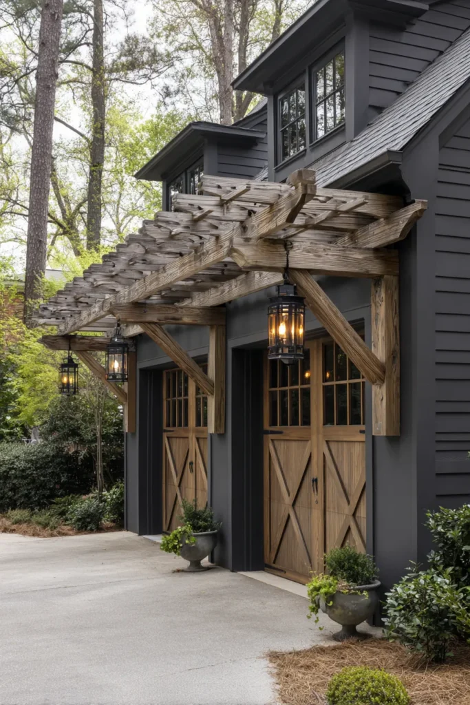 This absolutely stunning design uses a pergola to transform a simple garage wall into a truly incredible focal point. The structure is built from rough-hewn natural wood with unique, decorative cuts on the ends of the rafters, giving it a wonderfully rustic and custom feel. The natural tone of the pergola beams perfectly matches the gorgeous light-wood carriage-style garage doors, which feature charming cross-buck detailing, and two handsome iron lanterns hang from the structure, casting a warm glow against the sophisticated dark gray siding.