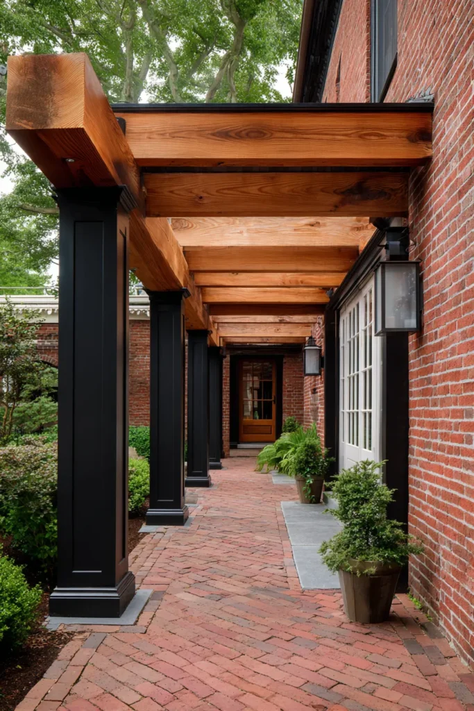 This super chic and stylish design features a pergola that creates a stunning, covered walkway extending along the side of a classic red brick home. The structure is built with striking contrast in mind, using substantial black columns paired with gorgeous, chunky natural wood rafters that have a rich, warm tone. The long pathway beneath is laid with matching red brick in a beautiful herringbone pattern, leading your eye down to the front door, while simple potted plants keep the look clean and sophisticated.