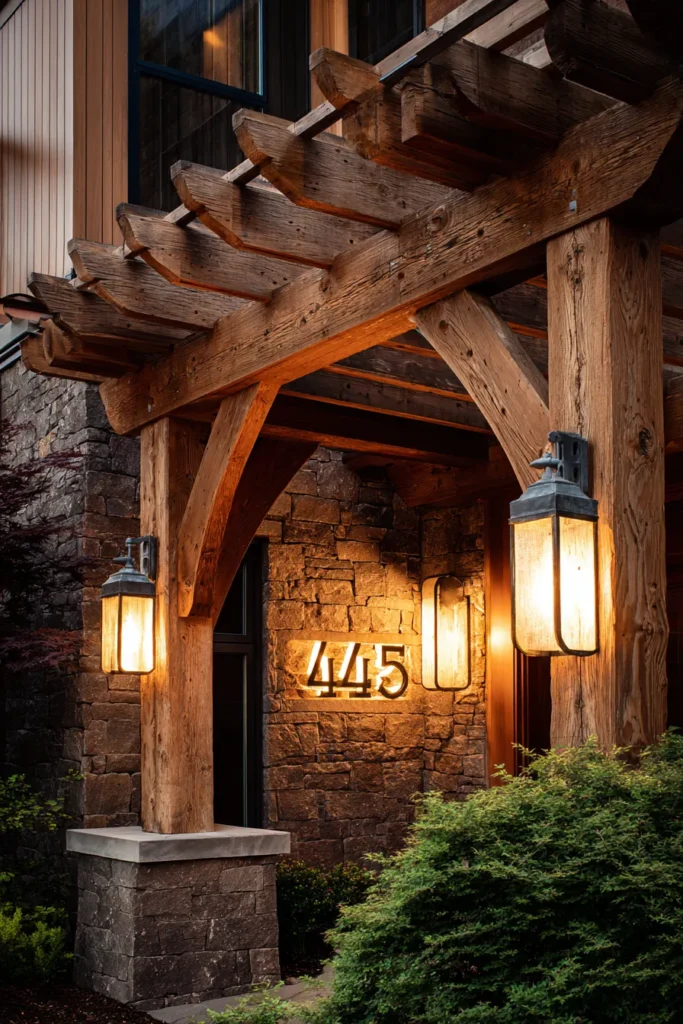 This pergola design is incredibly smart, using a rugged timber frame structure to perfectly highlight the home’s address and entryway lighting. The pergola is built with beautifully aged, distressed wood beams and posts that have an organic, rustic texture, and the supports rest on a solid stone and concrete base, connecting it seamlessly to the house’s stacked stone facade. Flanking the glowing house numbers are two gorgeous, oversized rustic lanterns hanging from the frame, which cast a warm, welcoming light over the entrance area.