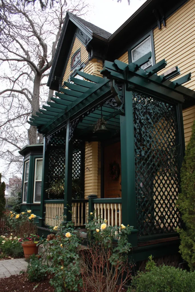 This truly unique home features a pergola that completely covers the front porch, creating a wonderfully intimate and dramatic entryway. The structure is painted a bold, deep hunter green, contrasting beautifully with the home’s creamy yellow siding, and it incorporates gorgeous lattice paneling on the sides for added privacy and a fantastic vintage touch. The top features classic, crisscrossed rafters and decorative metal scrollwork at the column tops, all sitting above a traditional railing, making the entire porch feel like a charming, sheltered outdoor room.