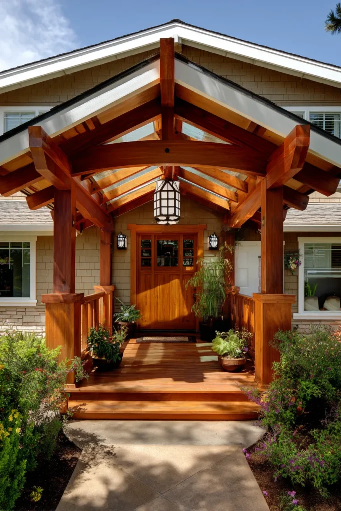 I’m completely obsessed with the warmth and quality of this design; it just exudes that beautiful, authentic Craftsman appeal, which I think is so cozy and enduring. The combination of the rich wood, the clean lines, and that clever covered roof really takes this beyond a simple pergola and turns it into a functional outdoor foyer. It makes the entire house feel incredibly established, welcoming, and beautifully detailed, instantly elevating the curb appeal with its rich, natural materials.
