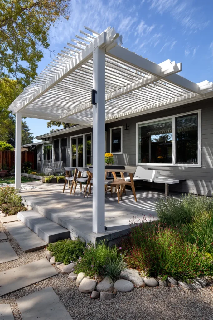 This beautiful design shows a contemporary white pergola extending over a lovely front or side patio, seamlessly blending indoor and outdoor living. The structure features a unique, tightly slatted roof that provides much more shade and architectural interest than a typical pergola, giving it a wonderfully clean, mid-century modern vibe. It covers a clean concrete patio that’s furnished with a chic outdoor dining set and a built-in bench, all surrounded by thoughtful, low-maintenance landscaping and gravel pathways, which keeps the whole look incredibly serene.