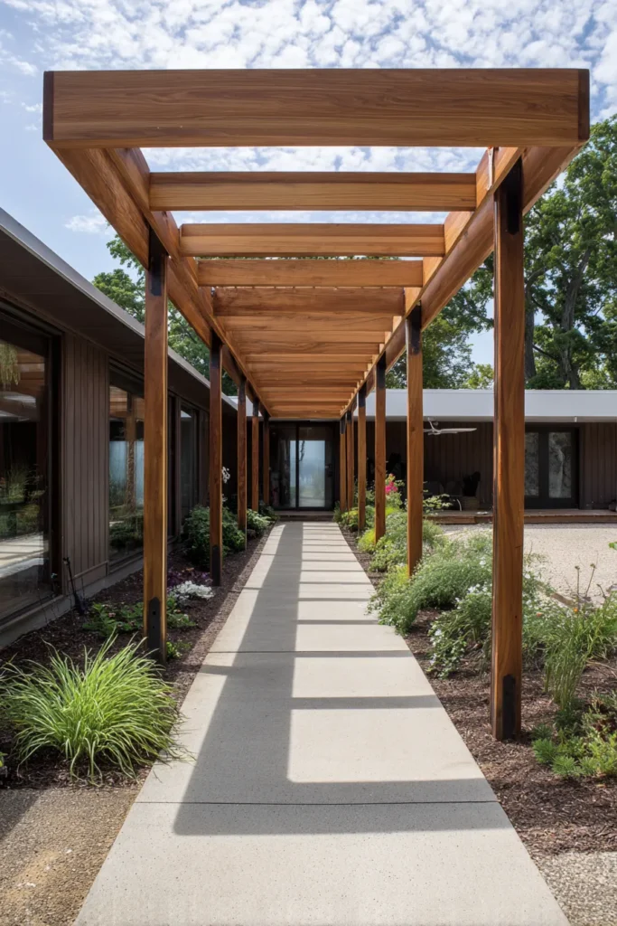 This is such a fantastic example of a mid-century modern pergola, featuring a long, linear structure built from gorgeous, smooth teak-toned wood. The design is beautifully minimalist with widely spaced rafters and posts, creating a long, sheltered walkway that guides your eye right to the front door of the home. The entire pergola stands over a clean concrete path, with borders of soft, natural landscaping on either side, which keeps the focus completely on the beautiful warm wood and the clean, striking lines.