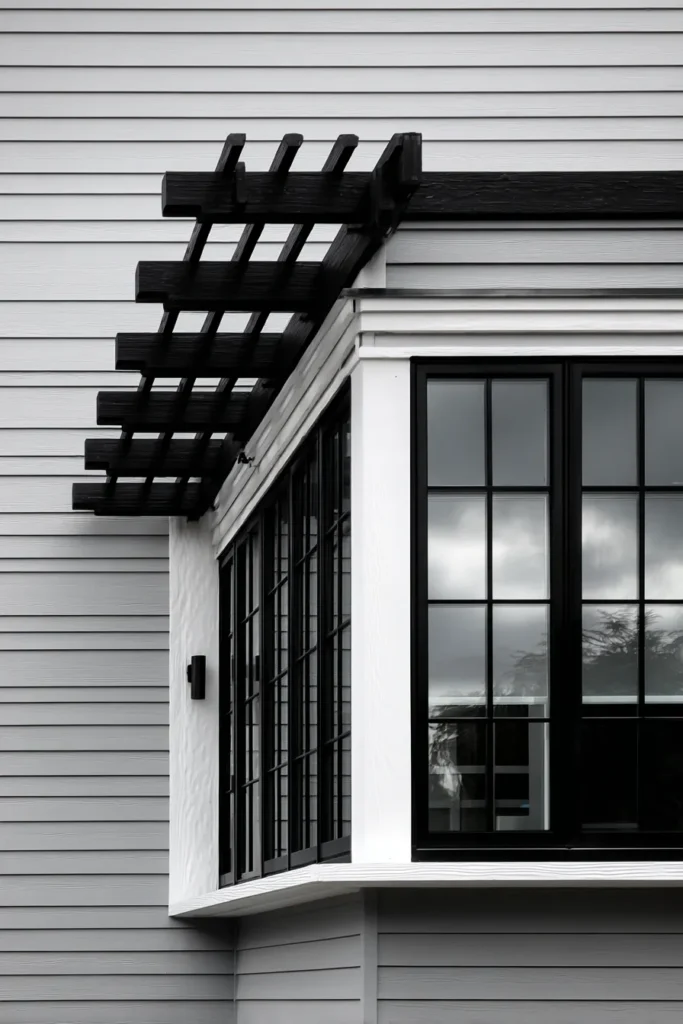 This is such a sharp, modern take on the traditional pergola, featuring a small “eyebrow” structure built right over a large corner window, which is such a smart architectural detail. The entire design is wonderfully monochromatic, with the pergola painted a deep, matte black which stands out beautifully against the home’s crisp light gray horizontal siding and the white window trim. The tightly-spaced rafters are left exposed, creating a neat, layered look that adds texture and subtle shade to the windows below, which makes the whole corner feel incredibly sleek and custom.
