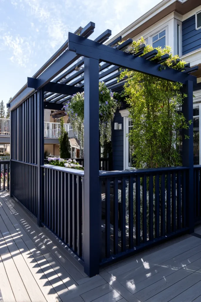 This fantastic design uses a small, functional pergola to create a totally private and defined seating area on a deck or front balcony, which is such a smart use of space. The entire structure, including the perimeter railing, is painted a gorgeous, deep navy blue, instantly making it feel modern and super sophisticated against the lighter deck boards. One side features vertical slats instead of an open railing, providing a wonderful screen for privacy and turning this little corner into a completely enclosed outdoor room that’s perfect for relaxing.