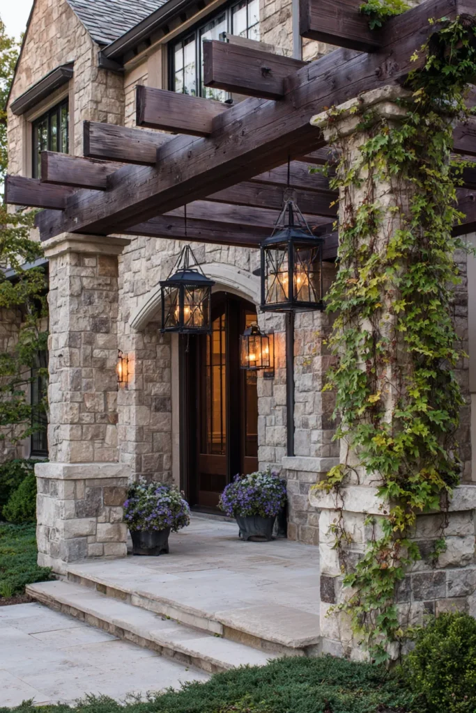 This magnificent entry features a gorgeous pergola supported by truly grand, stacked stone columns that perfectly match the facade of the home, creating an immediate sense of permanence and luxury. The rafters are crafted from substantial dark-stained wood beams, adding a stunning, rustic contrast to the light stone, and a lovely vine is beginning to climb one of the columns, hinting at future greenery. Two handsome wrought iron lanterns hang from the structure, casting a warm, inviting glow over the recessed dark wood front door and the perfectly placed potted flowers.