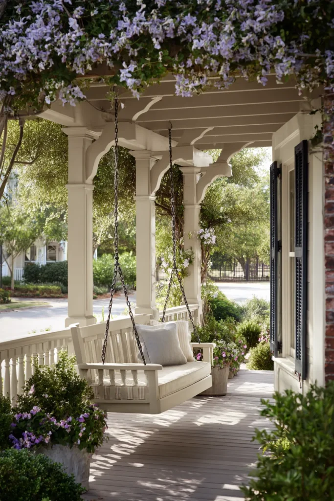 I think this design is just the absolute dreamiest because it creates such a wonderfully peaceful and incredibly welcoming space right at the front of the home, which is such a brilliant way to boost curb appeal. The combination of that cozy porch swing and the soft, floral cover is so wonderfully picturesque, reminding me of a charming Southern home, and it truly makes the front of the house look relaxed and incredibly inviting. It’s the perfect touch of romantic garden charm and functional outdoor living!