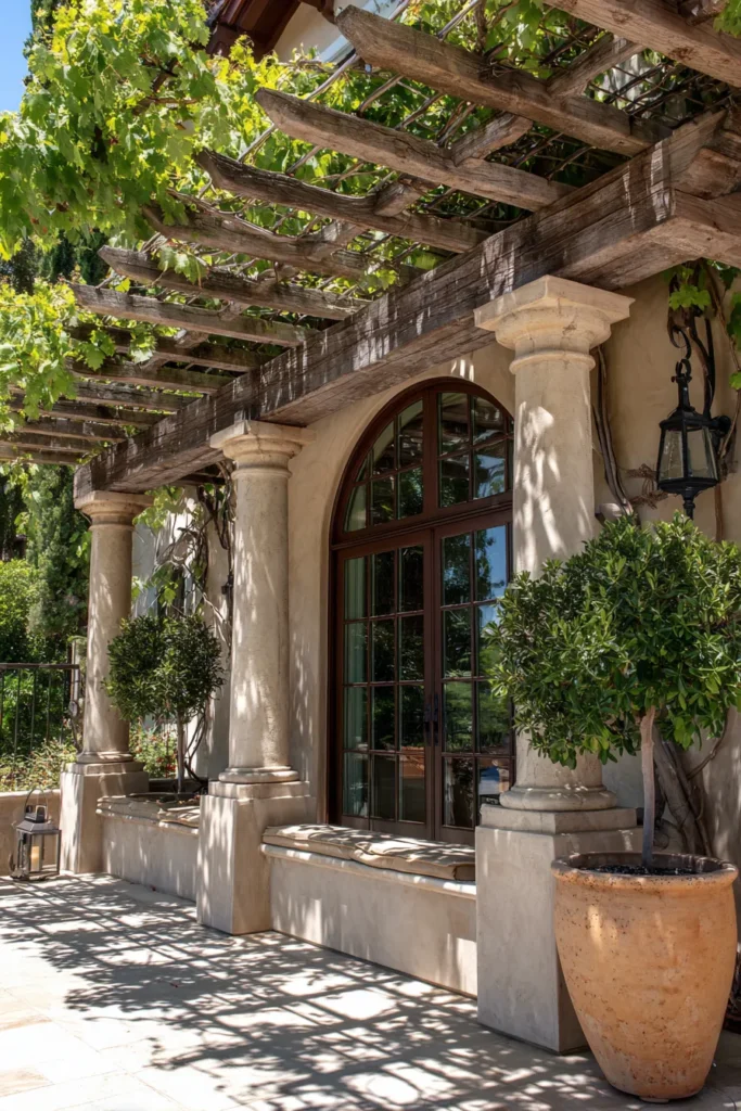 This absolutely gorgeous design channels that classic Tuscan villa charm with a pergola extending right over a grand arched entrance, giving it such a luxurious, old-world feel. The structure features beautiful weathered wood rafters that are perfectly imperfect, covered in lush, sprawling grapevine foliage that provides a dappled, cool shade below. It’s supported by truly elegant stone columns that match the stucco facade, all framing a stunning dark wood arched door and accented with large terra cotta planters and a classic black lantern.