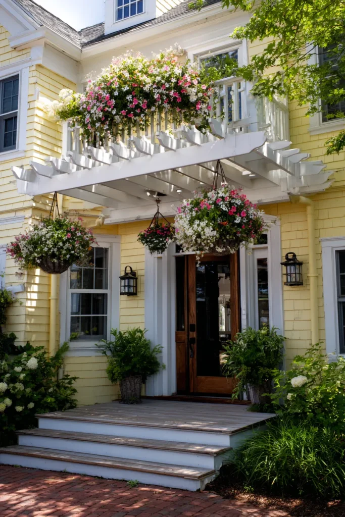 This incredibly charming home features a lovely, bright white two-tiered pergola structure built right above the front door, maximizing the floral curb appeal. The lower level of the pergola provides a perfect spot for two large, overflowing hanging baskets filled with pink and white blooms, framing the beautiful wood front door. The upper level supports a balcony railing and a long, linear planter box that’s absolutely spilling over with even more gorgeous flowers, creating a waterfall of color against the sunny yellow siding.