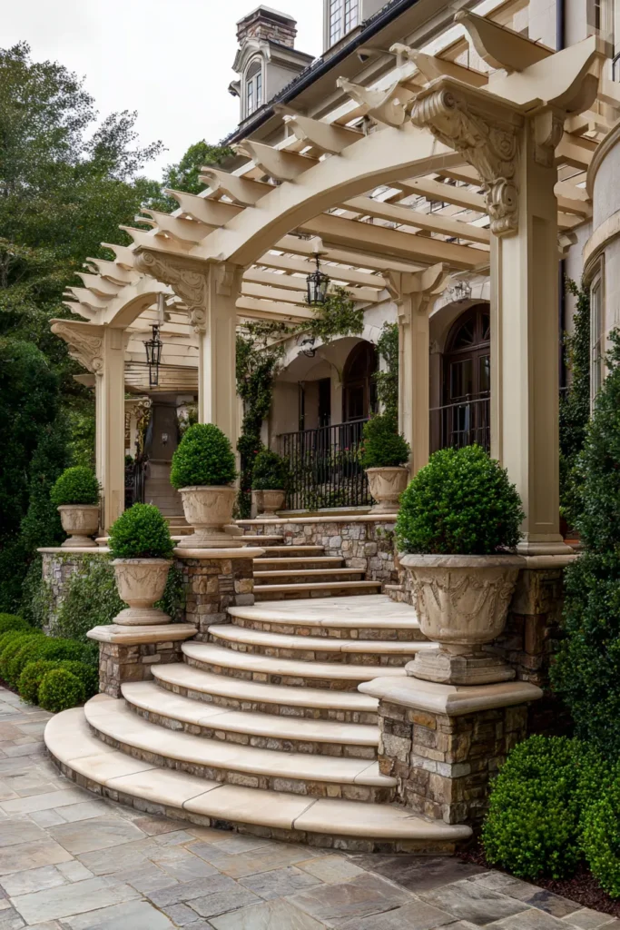 I am absolutely head over heels for the sheer drama and elegance of this design; it’s just breathtakingly beautiful, and I think it looks like a gorgeous Italian villa. The gentle curve of the stairs beneath the protective arch of the pergola is so welcoming and feels incredibly expensive, and those matching stone planters give it a timeless symmetry that just pulls everything together perfectly. Honestly, it turns a simple doorway into a majestic entrance, and who wouldn’t want that kind of incredible curb appeal every single day!