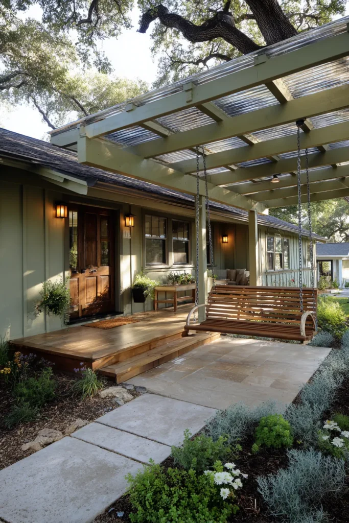 This super cozy front porch features a unique pergola structure painted a lovely soft green that blends perfectly with the home’s siding, creating a truly harmonious look. What makes this design so clever is the inclusion of a translucent roof panel over the rafters, which provides wonderful shelter from rain while still letting in all that beautiful sunlight. The pergola extends over a warm wooden porch, a stone patio area, and features the ultimate in relaxation: a built-in porch swing hanging from sturdy chains.