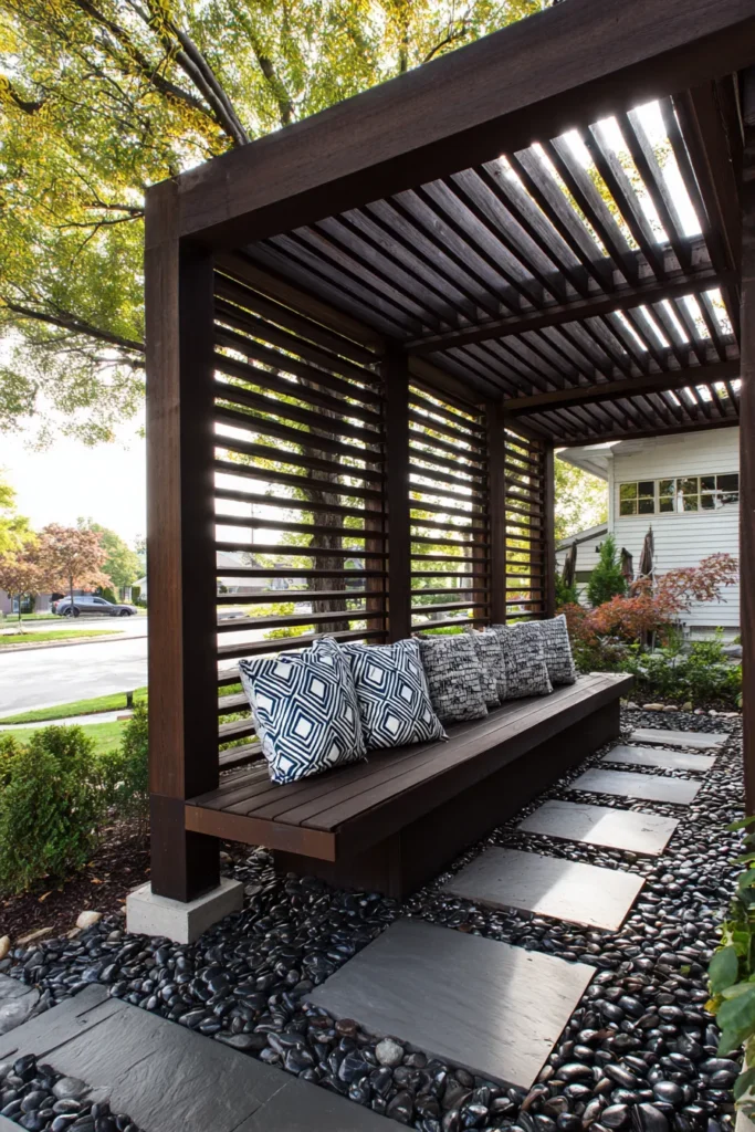 I am absolutely head over heels for this idea because it’s such a clever way to use a pergola to create a functional, stylish “waiting bench” or a little hideaway right outside your door, which is so smart for a friendly neighborhood setting. The combination of the rich, warm wood against those glossy black stones is just pure luxury, and it turns what would be an ordinary front yard into a designer-level landscape moment. It proves that a pergola doesn’t have to be attached to the house to be the ultimate curb appeal booster!