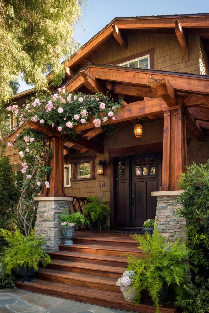 I’m completely obsessed with the layered warmth and texture happening here—it’s just so inviting and has this wonderful, lived-in luxury feel. That rich wooden pergola isn’t just a roof structure; it’s a living part of the design, especially with those stunning roses softening the strong lines. It’s the kind of entrance that makes you feel immediately cozy and sheltered, like you’re walking into a beautiful mountain retreat. This home perfectly shows how blending natural materials and a little floral romance can achieve maximum curb appeal goals!