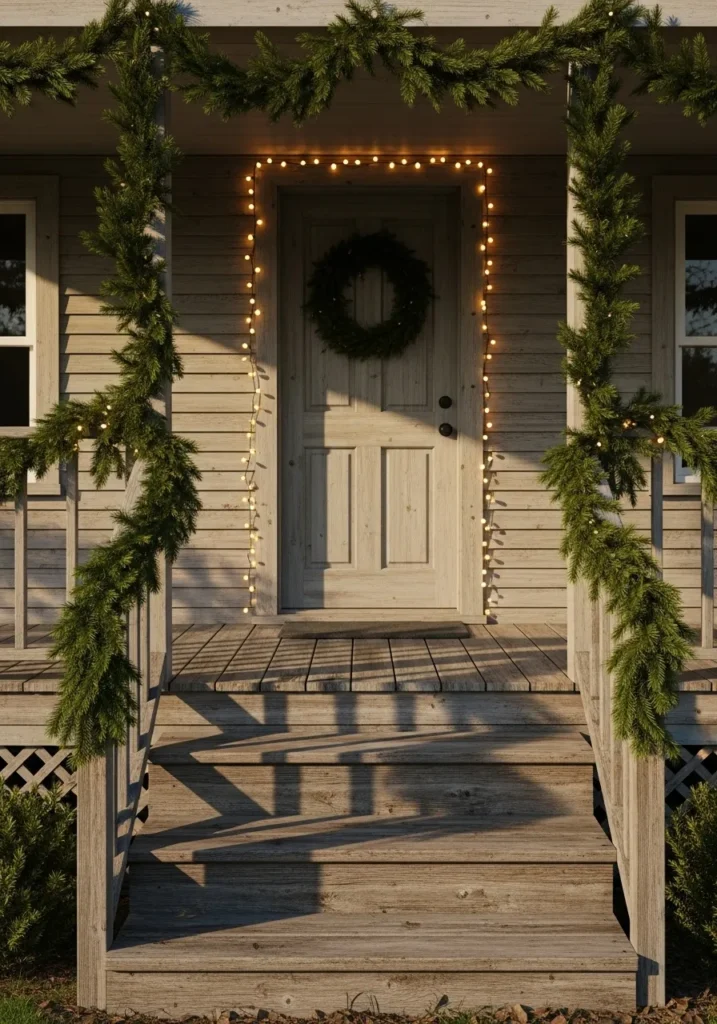 This rustic wooden porch is pure holiday charm. Soft golden fairy lights hang delicately around the door, while lush green garlands frame the entrance beautifully. The simple wreath adds the perfect natural touch, tying the whole look together in a classic Christmas way.