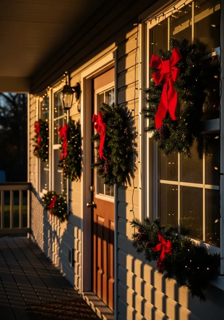 This cheerful front porch makes such a happy statement. Each window and door is framed with glowing fairy lights and lush wreaths topped with bright red bows. The way the evening sun hits the decorations makes everything shimmer with that unmistakable holiday magic.