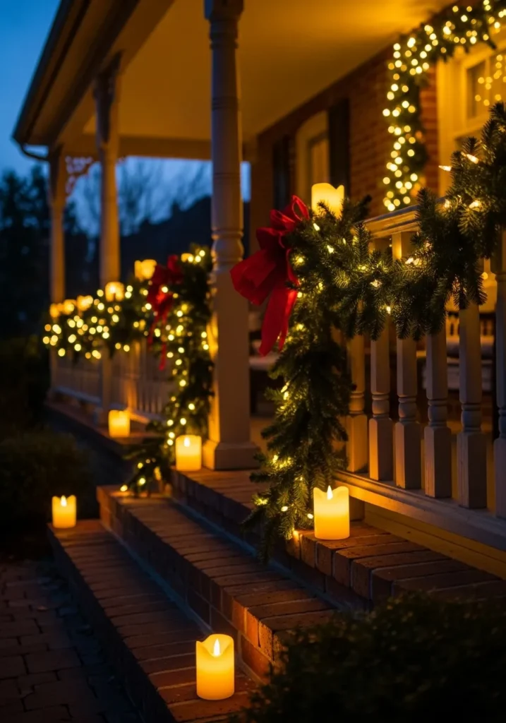 This elegant porch feels straight out of a Christmas storybook. Garland drapes along the railing, dotted with red ribbons and warm twinkle lights. Flickering candles line the brick steps, guiding guests up with a soft golden glow that feels almost magical.