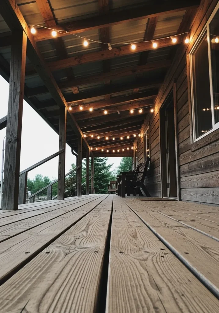 This rustic wooden porch glows softly under a row of warm string lights, perfectly spaced along the roof beams. The natural wood tones of the floor and siding give the space an earthy, grounded feeling that pairs beautifully with the simple, cozy lighting. It feels open and peaceful, like the kind of porch where time slows down and conversations last for hours.