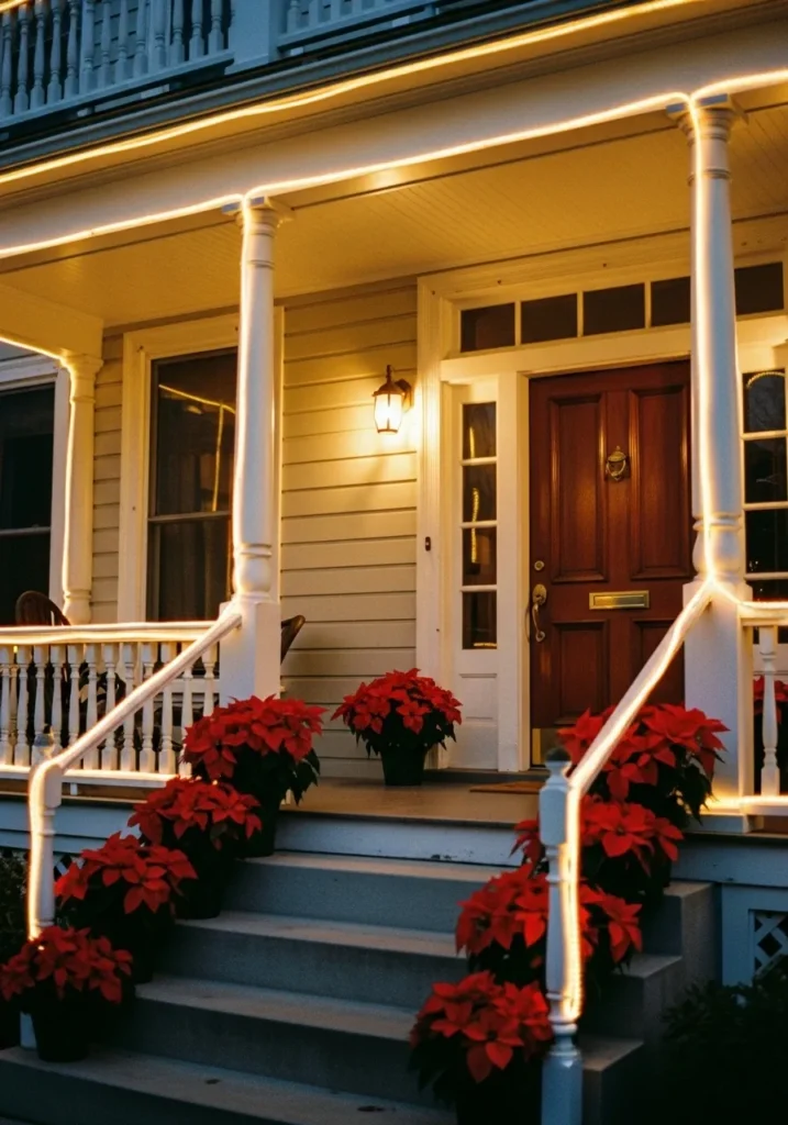This classic porch design radiates Christmas cheer with its glowing rope lights outlining the railing and pillars. Bright red poinsettias line the steps like a festive path, leading straight to the rich wooden front door. The soft yellow glow from the lantern adds that cozy, timeless touch that makes the whole scene feel straight out of a holiday movie.